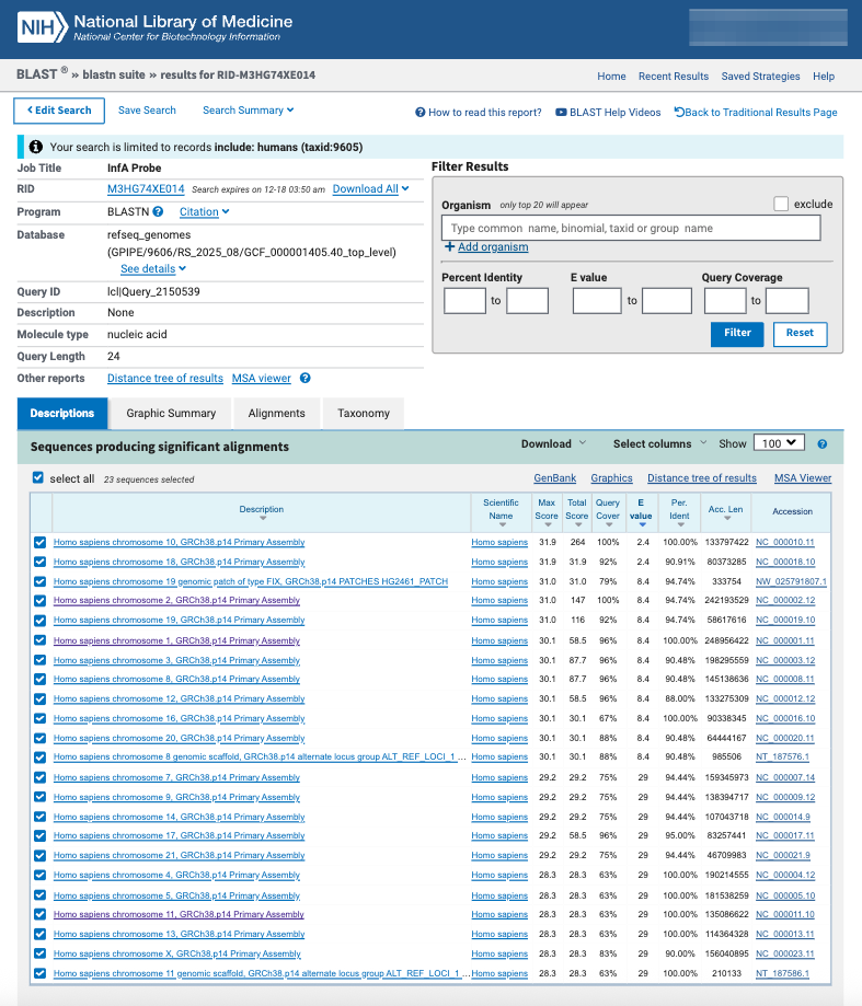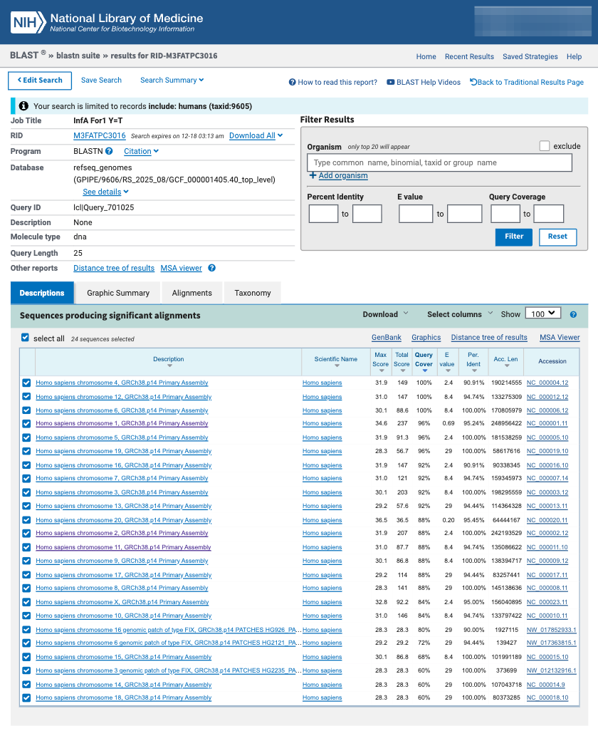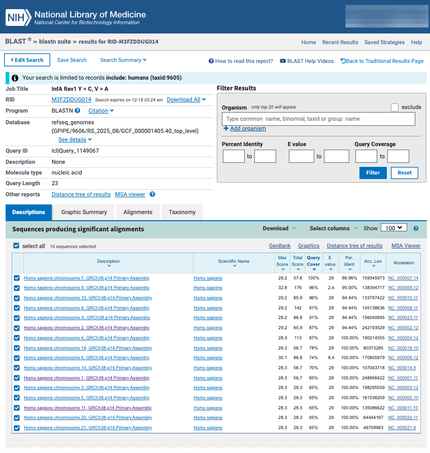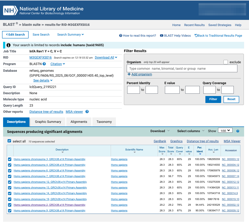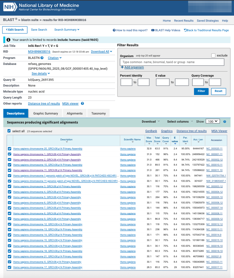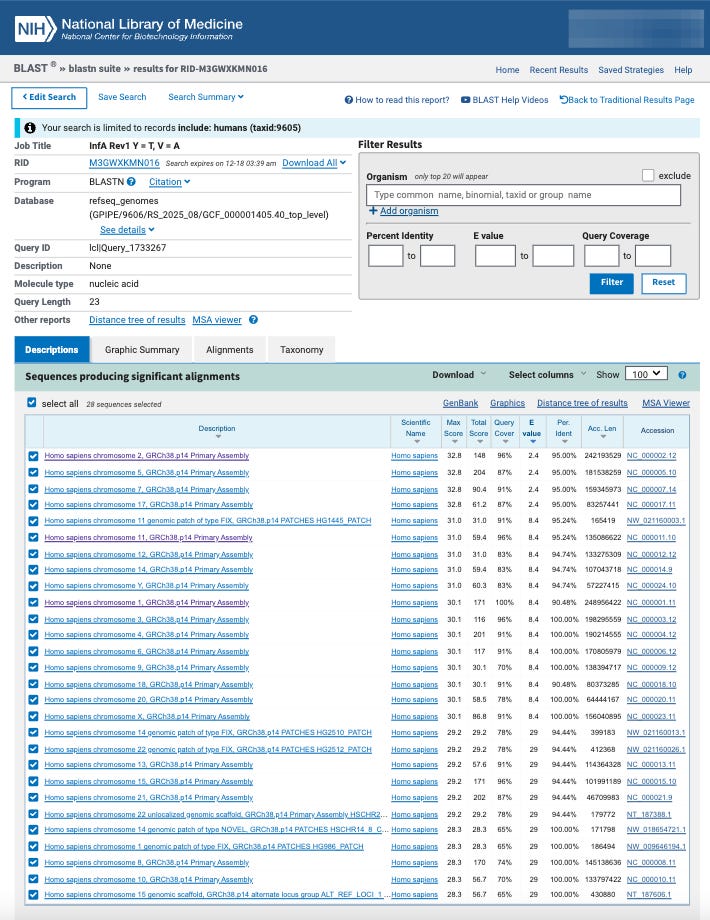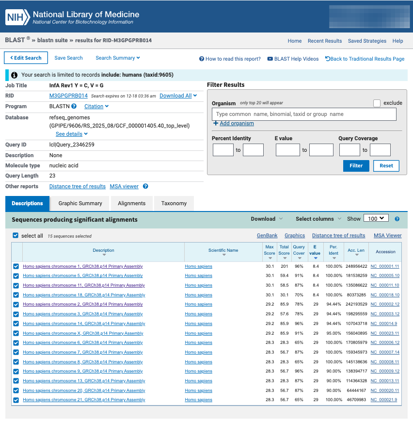 Using the government’s BLAST (Basic Local Alignment Search Tool) software, we tested whether any of these three PCR sequences used to count influenza A infections match any human genome sequences.