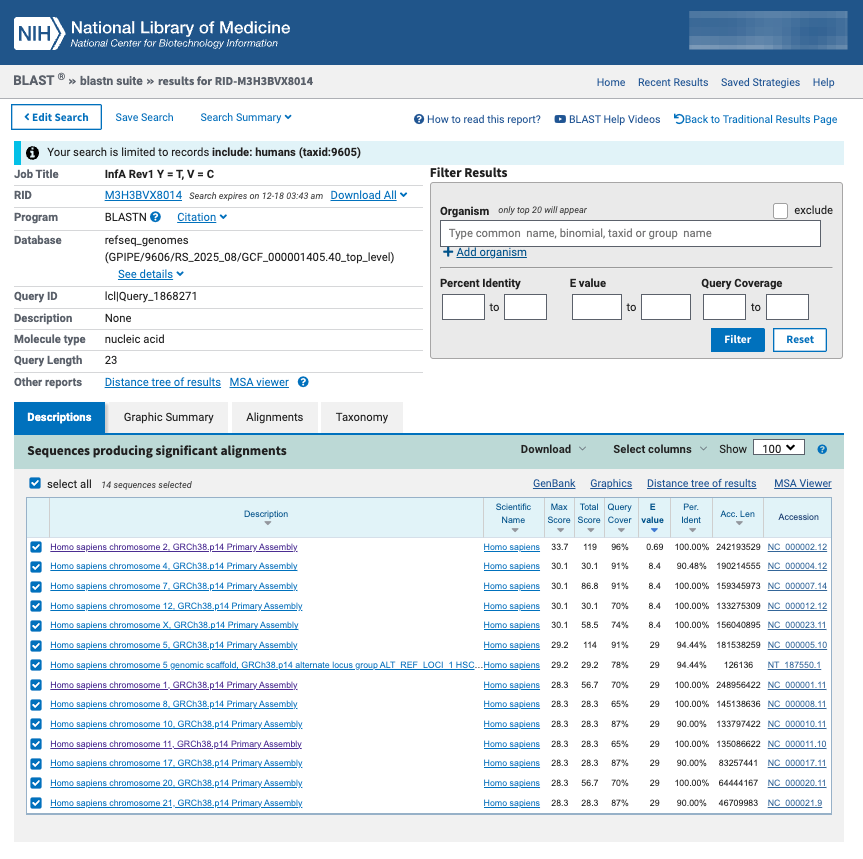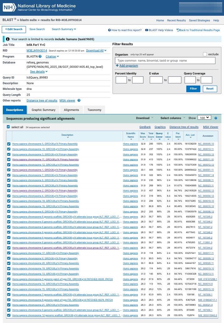 When we substituted the CDC’s forward primer Y ambiguity code for T, the results reveal that the primer sequence produces numerous significant alignments distributed across most human chromosomes, including chromosomes 1 through 13, 15 through 20, X, and several genomic patches or scaffolds.