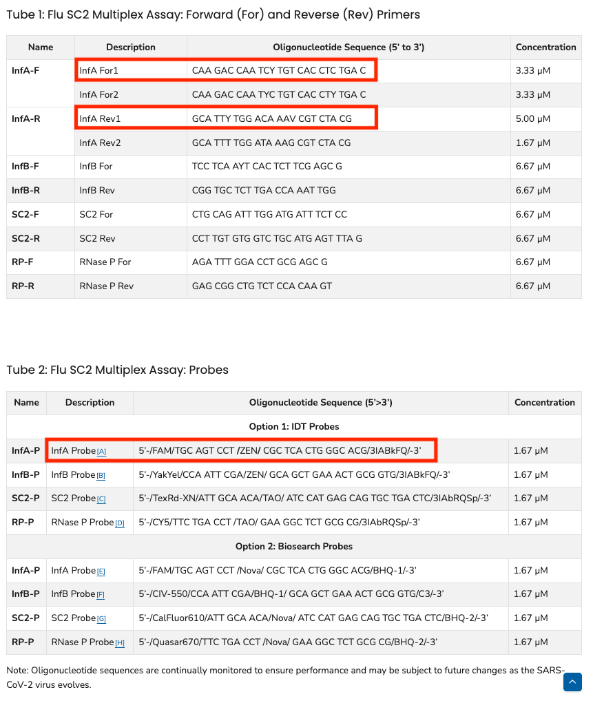 The U.S. Centers for Disease Control and Prevention (CDC) shares the primer and probe sequences for its ‘Influenza SARS-CoV-2 (Flu SC2) Multiplex Assay,’ shown below with red boxes indicating the influenza A forward primer, reverse primer, and probe.
