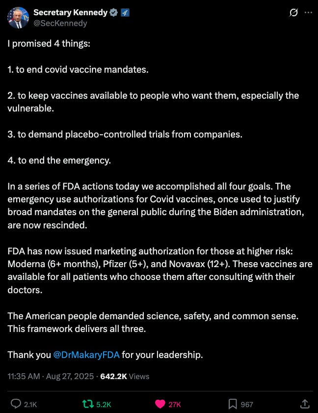 In a series of FDA actions today we accomplished all four goals. The emergency use authorizations for Covid vaccines, once used to justify broad mandates on the general public during the Biden administration, are now rescinded.”