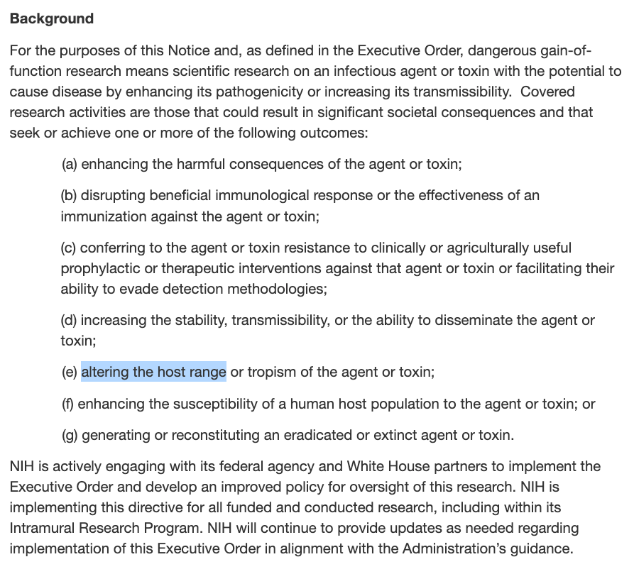 This means that under NIH’s own definition, experiments that alter a virus’s host range fall within the federal gain-of-function category.