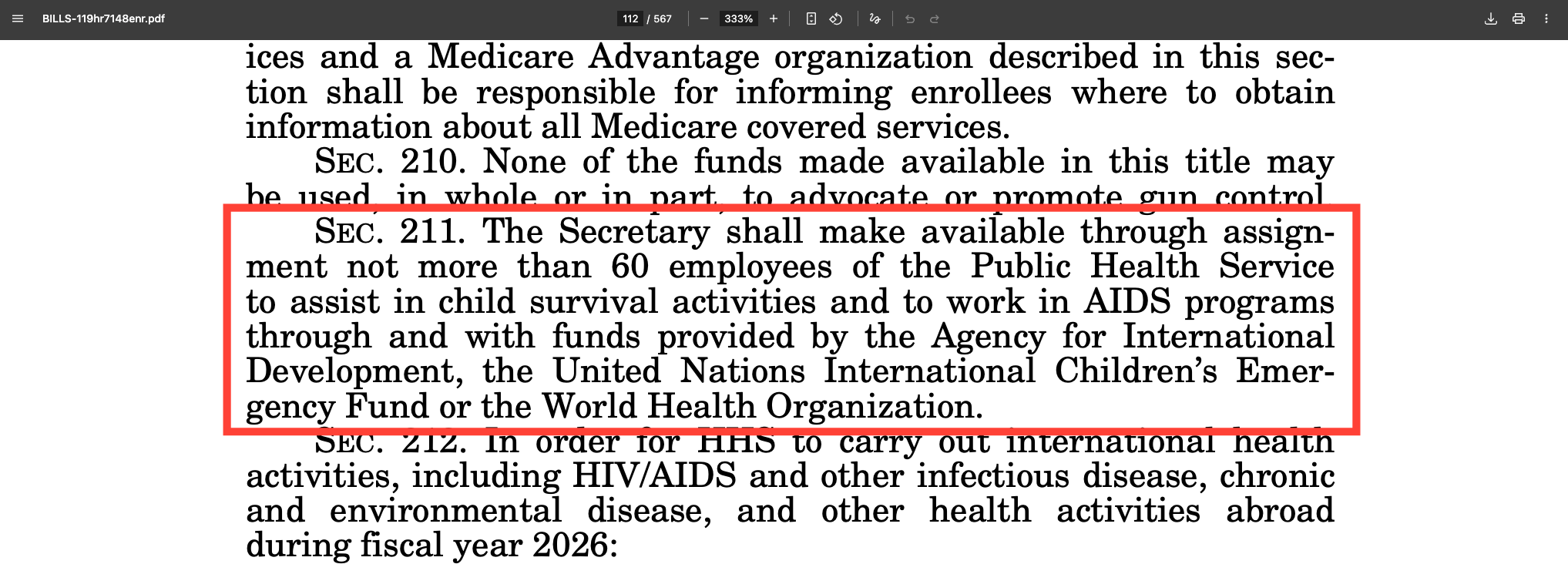 Yet H.R. 7148—passed by both the House and Senate and signed by Trump—creates a statutory exception allowing U.S. personnel to continue working within WHO-funded programs, despite the withdrawal.