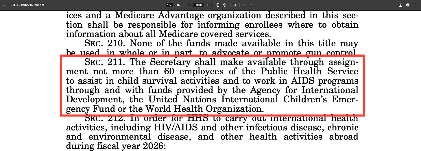 Congress has authorized up to 60 U.S. Public Health Service employees to be assigned to work through and with WHO-funded programs, alongside USAID and UNICEF—entities closely integrated with the same global health governance framework.