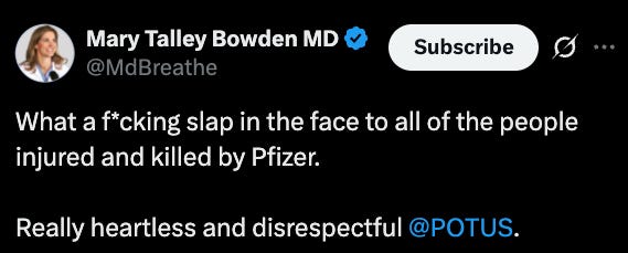 Dr. Mary Talley Bowden—who successfully treated over 6,000 COVID patients during the pandemic using early outpatient protocols, not vaccines—called Trump’s move “a f*cking slap in the face to all of the people injured and killed by Pfizer.”